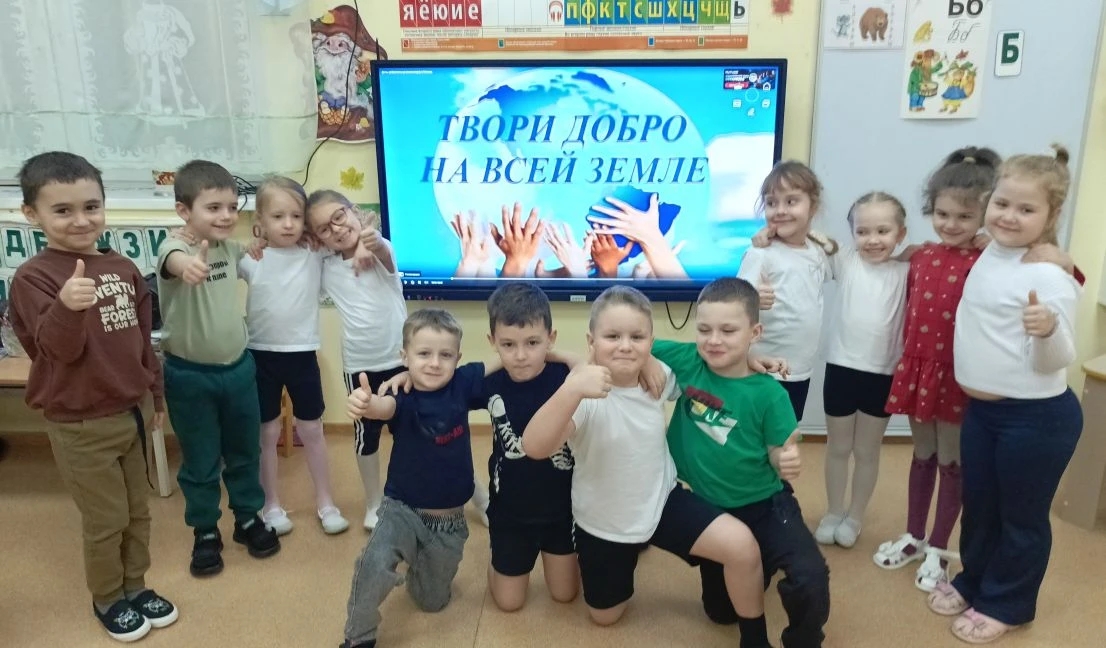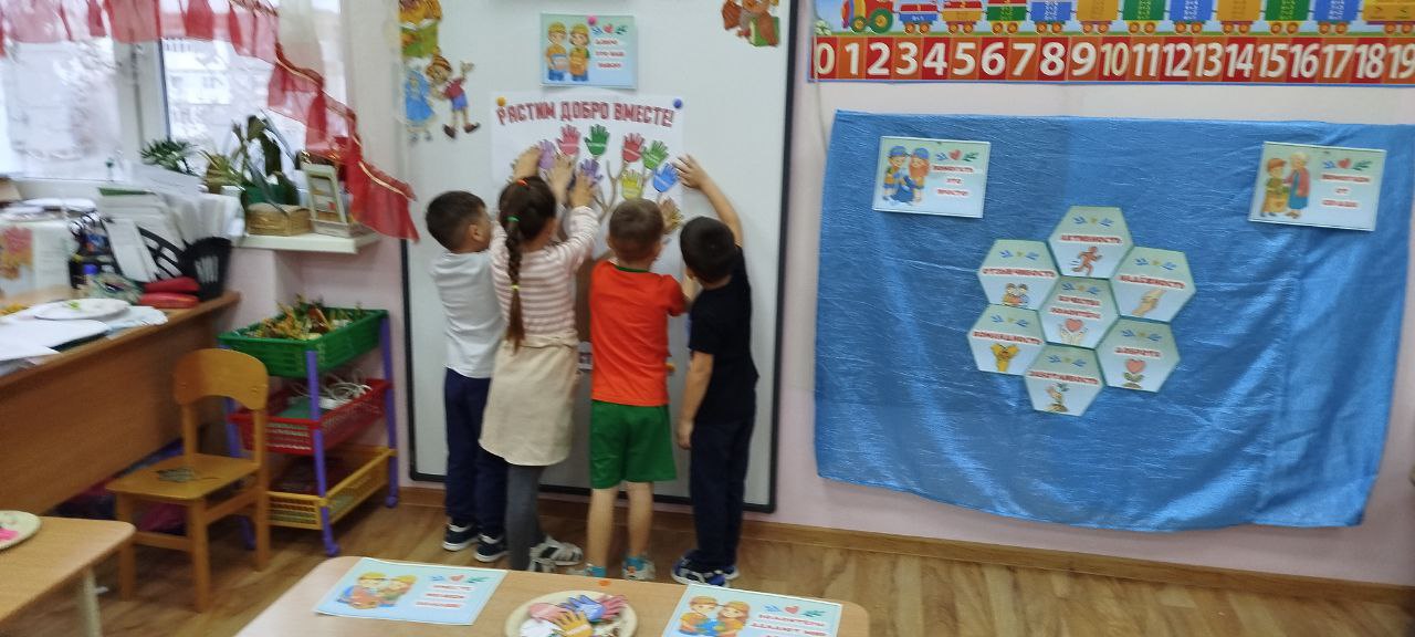 с добрыми поступками детей, совершенными в разное время.Также дети прослушали и обсудили гимн, рассмотрели символы волонтёрского движения.