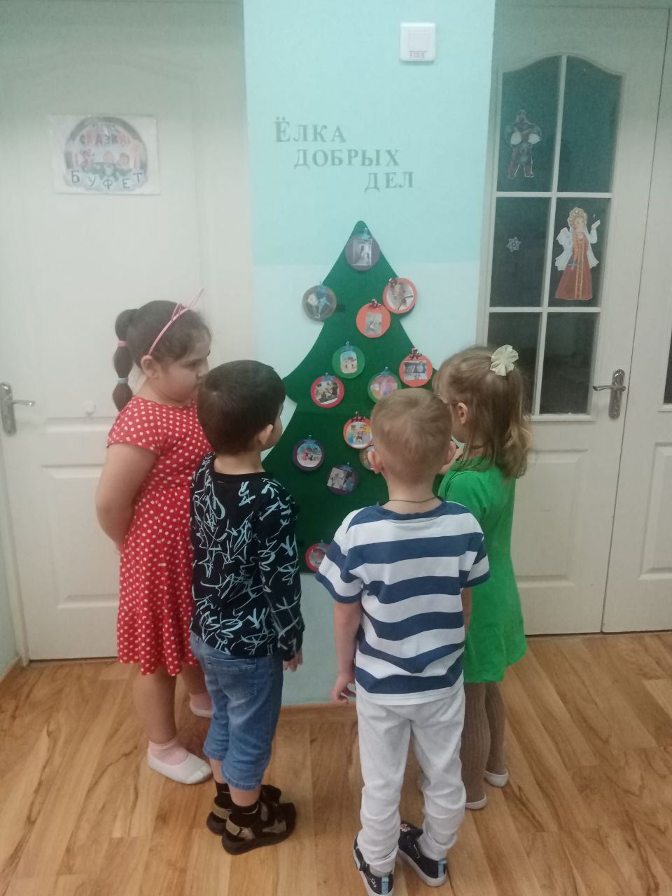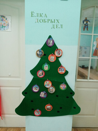 Ребята обсудили вопросы: "Что такое доброта?", "Добрый поступок". В группе была оформлена "Елка добрых дел", на которой в виде новогодних шаров были развешаны фотографии